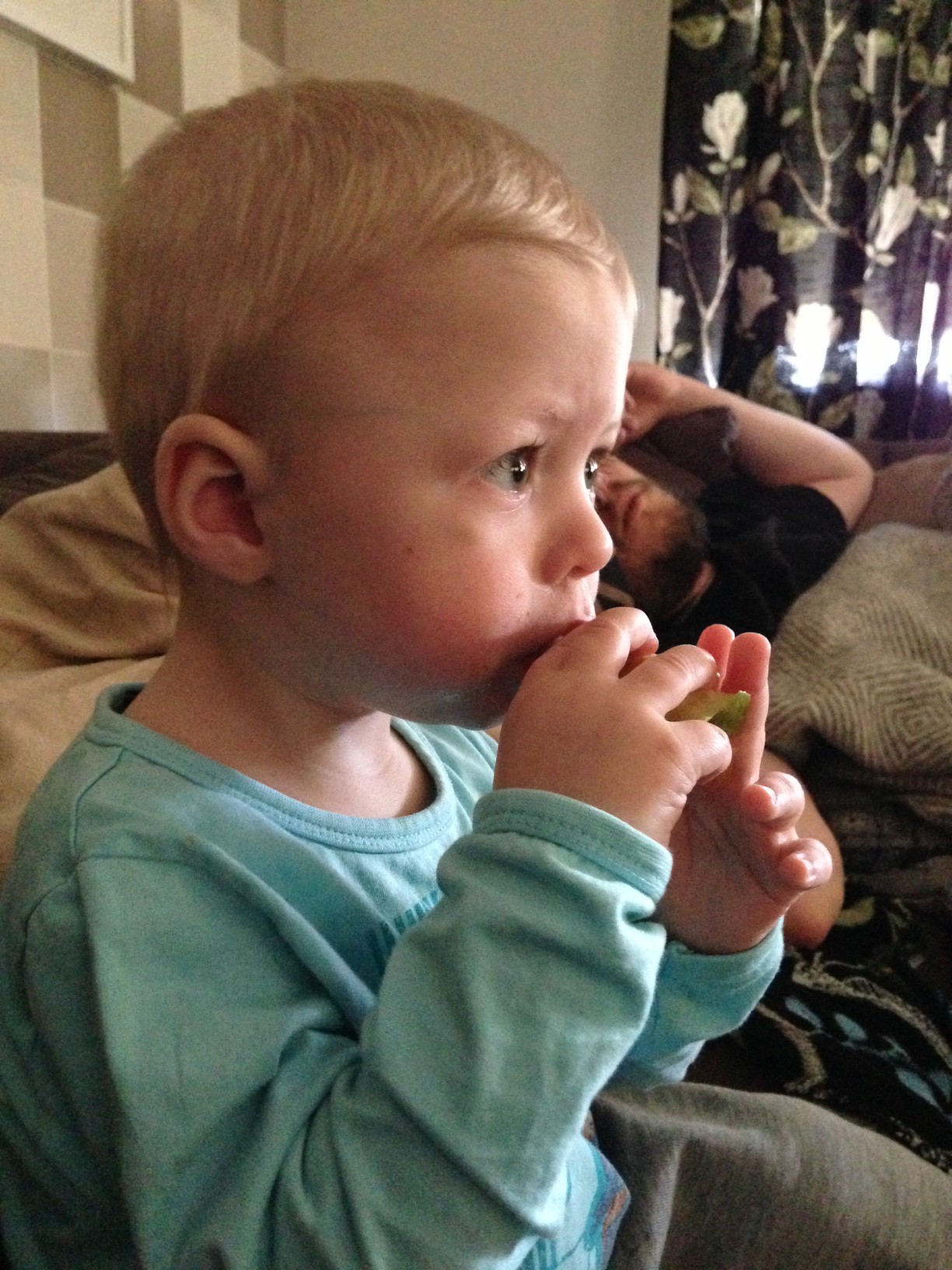 Sonen tyckte det var en bra ide att vakna mitt i natten och vara vaken i en timma lite drygt. Så det var är trött mamma idag…Neo har varit extremt mammig, och inte nå vidare nöjd med nått. Men det har gått relativt bra ändå. Skönt när Jonas kom hem så Neo fick klänga lite på pappa istället.